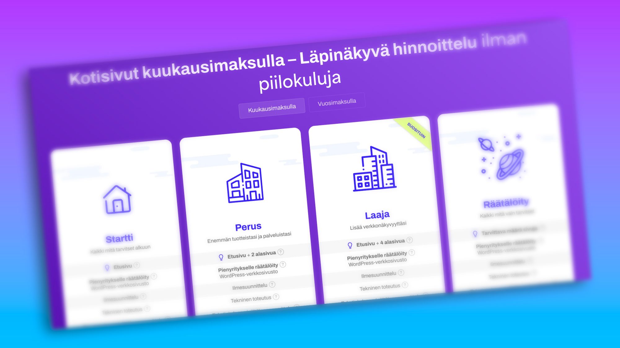 Kotisivut kuukausimaksulla yritykselle – kannattaako? Blogi Kotisivut kuukausimaksulla yritykselle – kannattaako?Kotisivut kuukausimaksulla yritykselle sopivat, kun haluat selkeät kulut, nopean aloituksen ja ylläpidon ilman suurta alkuinvestointia.Kajahdus8.4.2026